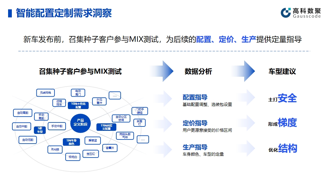 智能配置的有效应用可以帮助企业提升产品和服务的智能化水平。在实际应用中,顺发配资帮助车企在新车发布前召集种子客户参与MIX测试,顺利获得收集种子客户的反馈和数据,车企能够精细调整产品配置,为后续的配置、定价、生产给予定量指导。同时,这种方法不仅有助于提高产品质量,还能提前发现潜在问题并及时解决。