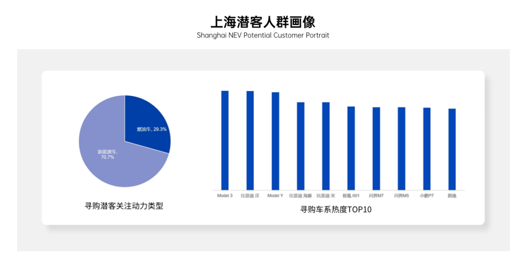 在购车偏好方面,上海的新能源汽车寻购潜客表现出强烈的对新能源车型的偏好,其中新能源车占意向车系的比例高达70.7%。在排名前十的意向车型中,新能源车型占据前九位,仅有一款燃油车型(即朗逸)跻身其中。